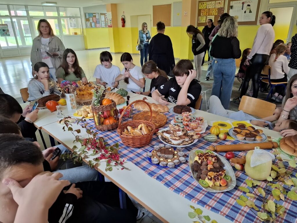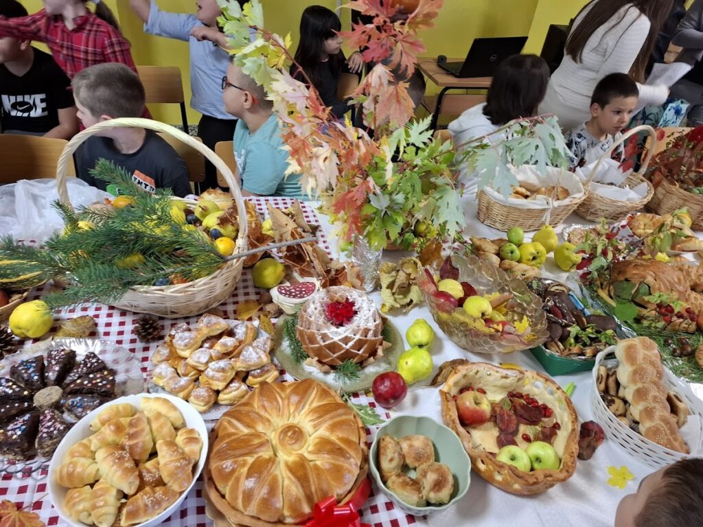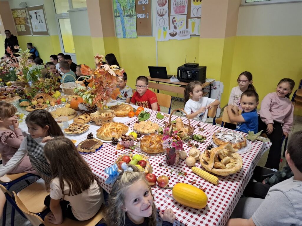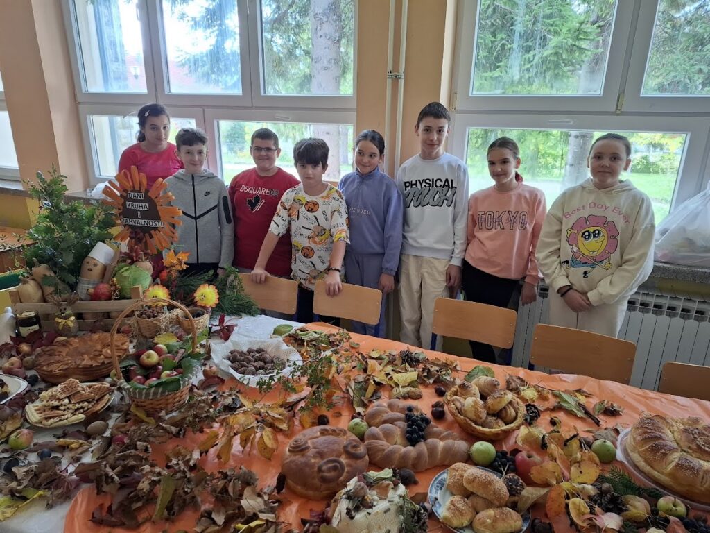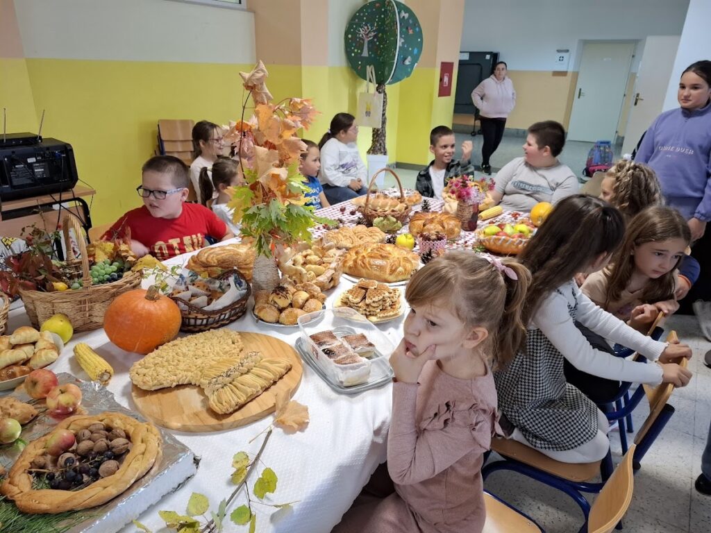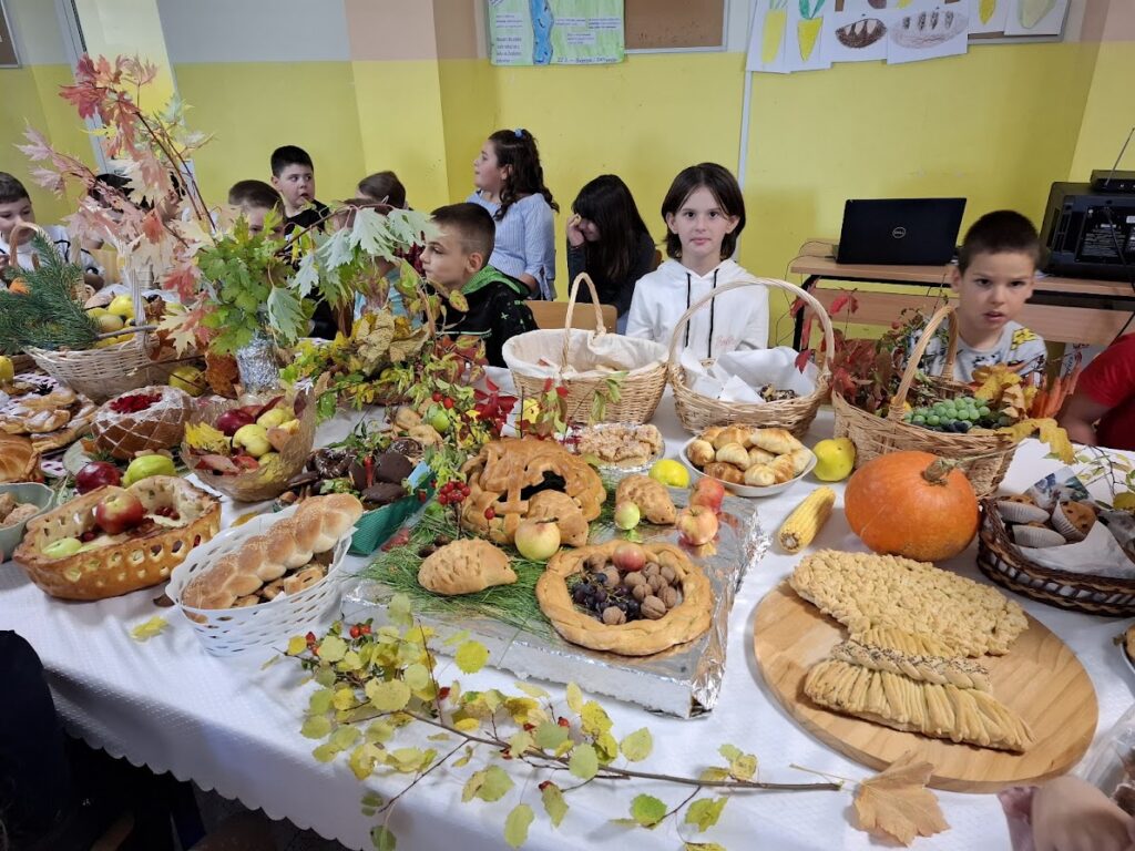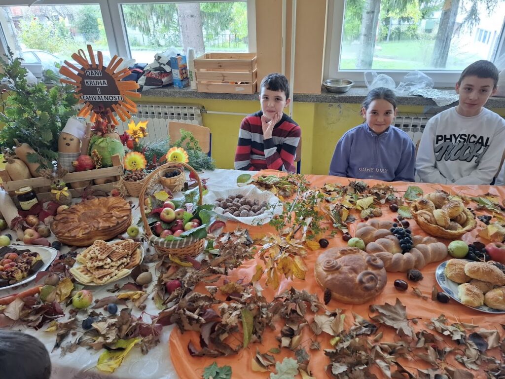 Učenici i učitelji pripremili su bogat stol s domaćim kruhovima, pecivima, kolačima i raznim plodovima jeseni, kojima su izrazili zahvalnost za sve darove prirode.