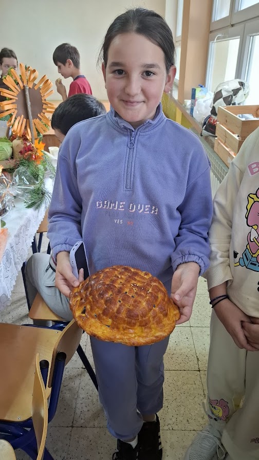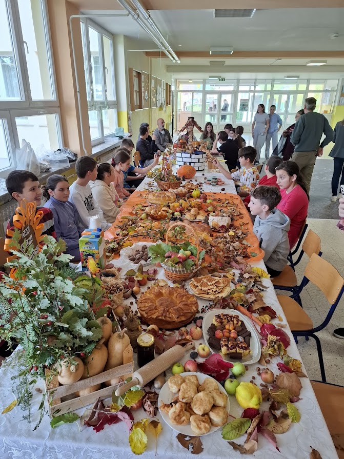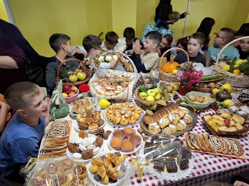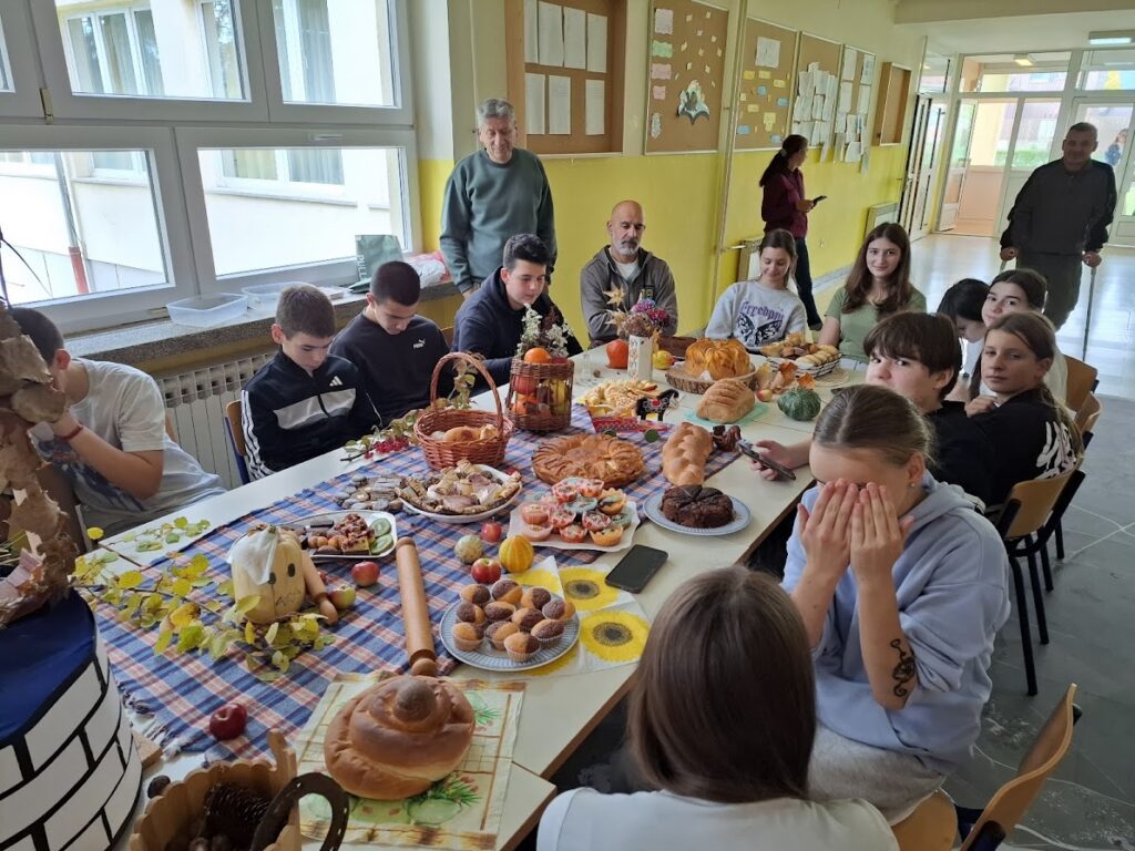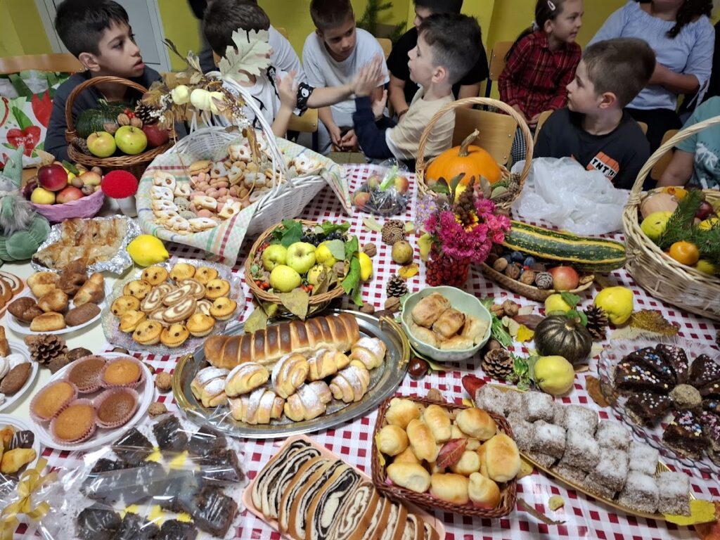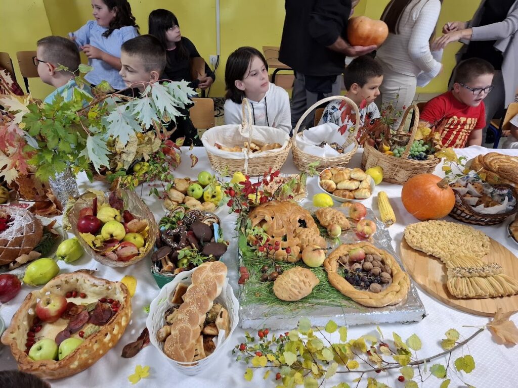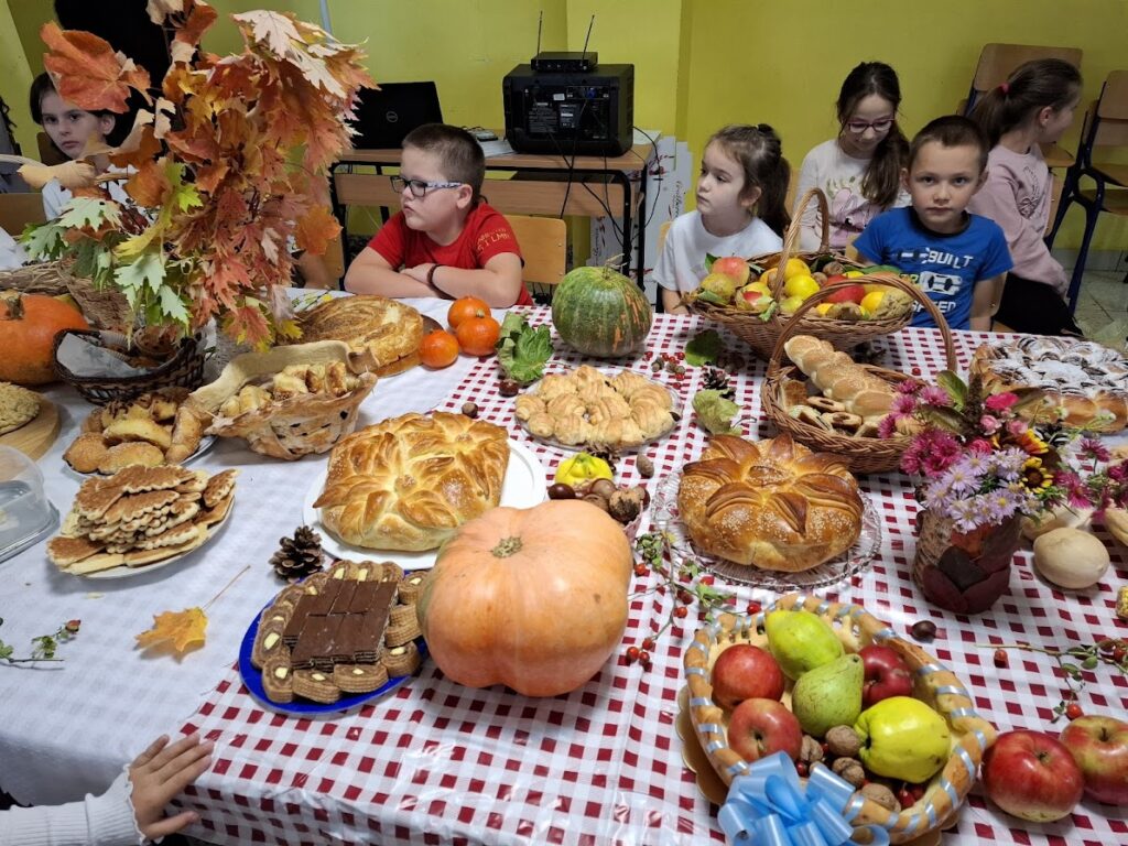 Učenici i učitelji pripremili su bogat stol s domaćim kruhovima, pecivima, kolačima i raznim plodovima jeseni, kojima su izrazili zahvalnost za sve darove prirode.